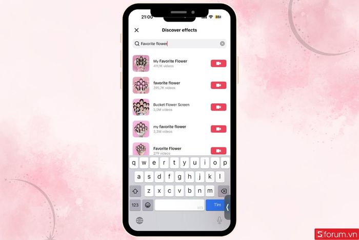 Nhập cụm từ “Favorite Flower” vào thanh tìm kiếm, sau đó chọn hiệu ứng tương ứng xuất hiện trên màn hình. Hệ thống sẽ yêu cầu bạn tải lên bức ảnh mong muốn từ thư viện. Khi ảnh được tự động tách nền và lồng vào hiệu ứng, bạn chỉ cần nhấn quay/chụp để lưu lại thành phẩm và đăng lên kênh của mình, video cũng sẽ được lưu trực tiếp về máy.