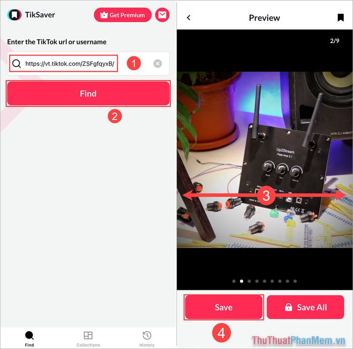 Bước 3: Sau khi sao chép liên kết, mở lại ứng dụng TikSaver và dán liên kết vào ô thoại (1). Sau đó, nhấn Find (2) để tìm kiếm tất cả các hình ảnh có trong Video TikTok.