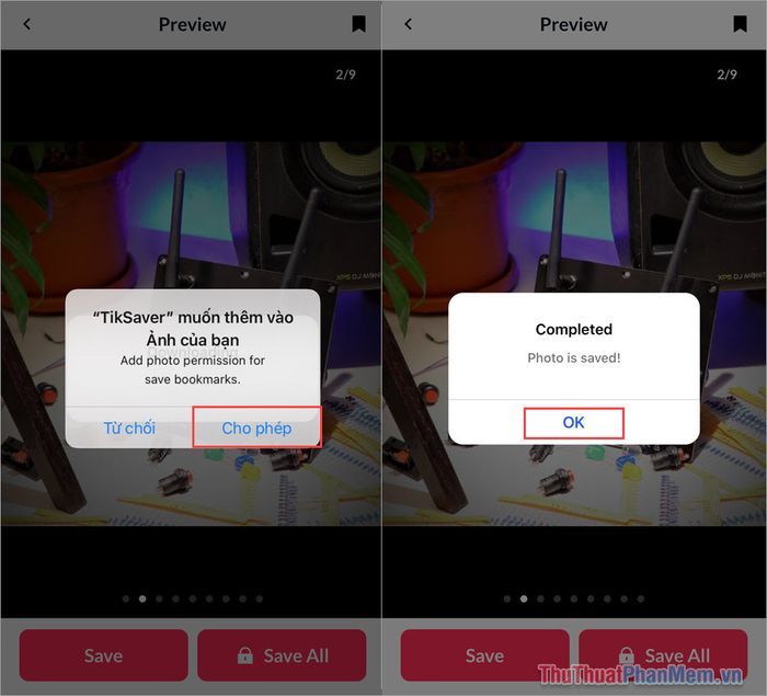 Bước 4: Khi bạn lưu hình ảnh trên TikTok lần đầu tiên, bạn cần nhấn Cho phép để TikSaver có quyền truy cập vào thư viện ảnh của bạn. Sau khi tải ảnh hoàn tất, hệ thống sẽ hiển thị thông báo Completed và bạn chỉ cần nhấn OK để kết thúc.