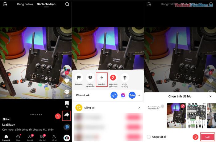 Mở ảnh bạn muốn lưu trên TikTok, nhấn vào mục Chia sẻ (1), sau đó chọn Lưu ảnh (2) để tải hình ảnh về điện thoại. Trong cửa sổ lưu ảnh, chọn các hình ảnh cần lưu và nhấn Lưu (3) để hoàn tất.