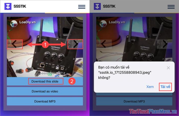 Bước 3: Khi SSSTik đã truy xuất được các hình ảnh từ Video, bạn có thể vuốt Trái – Phải (1) để xem tất cả hình ảnh. Sau đó, chọn Download this slide (2) để tải từng hình ảnh về máy.