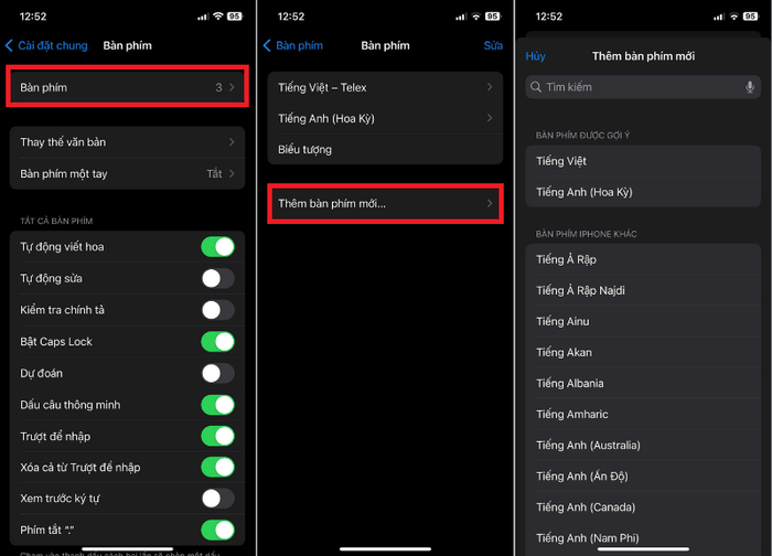 Bước 2: Chọn Bàn phím → Nhấn Thêm bàn phím mới → Chọn ngôn ngữ bạn muốn thêm (ví dụ: Tiếng Việt, English...).