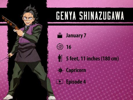 Genya Shinazugawa - 7 tháng 1Genya là một Demon Slayer nóng tính với quá khứ đầy ám ảnh, khi chứng kiến phần lớn gia đình mình (ngoại trừ Sanemi) bị mẹ quái vật giết hại. Vì vậy, anh quyết tâm tiêu diệt quái vật—và mặc dù không thể sử dụng Kỹ thuật Hơi thở, Genya lại có khả năng đặc biệt hấp thụ năng lực của quái vật. Anh khá khó chịu lúc đầu, nhưng dần dần trở nên hòa đồng hơn trong series.