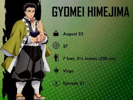 Gyomei Himejima - 23 tháng 8Gyomei là Stone Hashira trầm tĩnh và ít nói. Mặc dù Gyomei là người rất lớn, mạnh mẽ và đầy sức mạnh, nhưng thực chất anh lại rất nhạy cảm. Trong mắt các Hashira và Demon Slayers khác, Gyomei vừa là người có quyền lực, vừa là người biết quan tâm, tận tâm với vai trò diệt quái vật và mong muốn người khác cũng làm như vậy. Anh còn có một tình yêu sâu sắc với tất cả sinh vật sống và dễ xúc động (thậm chí với những điều tưởng chừng vô nghĩa).