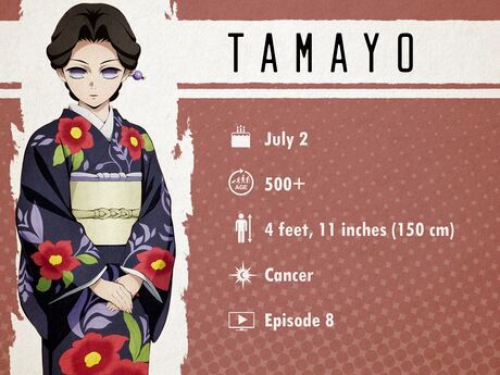 Tamayo - 2 tháng 7Tamayo là một trong những con quái vật không ác trong bộ phim, và thực tế là một bác sĩ sử dụng khả năng của mình để bảo vệ và chữa trị cho con người. Cô luôn rất nhân hậu, từng hỗ trợ Tanjiro trong việc mong muốn biến chị gái Nezuko của anh trở lại thành người, mặc dù xác suất thành công là rất thấp.