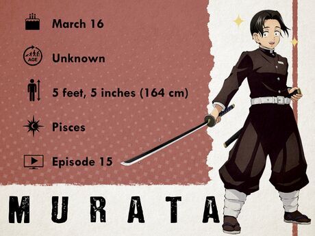 Murata - 16 tháng 3Murata là một trong số ít con người hoàn toàn bình thường tham gia vào các trận chiến trong Demon Slayer, tập luyện cùng Demon Slayer Corps mặc dù không có khả năng đặc biệt và chỉ có chút ít thiên hướng về thở nước. Mặc dù hầu hết con người không đủ sức mạnh để chiến đấu với quái vật, và bản thân Murata cũng không mạnh như các Slayer khác, anh vẫn luôn tìm cách hỗ trợ đồng đội trong mọi trận chiến.