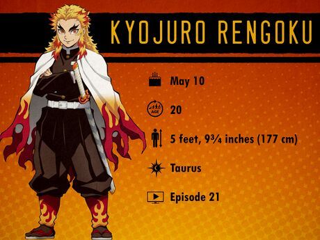 Kyojuro Rengoku - 10 tháng 5Kyojuro là Fire Hashira vui vẻ và nhiệt huyết. Anh là người rất cởi mở và chân thành, tuân thủ một bộ quy tắc đạo đức nghiêm ngặt và tôn thờ danh dự. Với thái độ lạc quan không thể bị dập tắt, Kyojuro luôn cố gắng tìm thấy điều tích cực trong mọi tình huống—và điều này khiến anh trở thành một nhân vật được yêu thích bởi người hâm mộ.