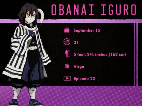 Obanai Iguro - 15 tháng 9Obanai là một Demon Slayer và là Serpent Hashira. Anh hoàn toàn phù hợp với hình mẫu “u ám và bí ẩn”, và rất khắt khe—với cả bản thân lẫn các Demon Slayer khác. Anh đặt ra những tiêu chuẩn cực kỳ cao, gần như không thực tế và chỉ trích đồng đội mà anh cho là “yếu đuối,” khiến anh có vẻ rất tàn nhẫn. Tuy nhiên, anh cũng có một mặt mềm mại đôi khi thể hiện, đặc biệt là khi ở bên Mitsuri.