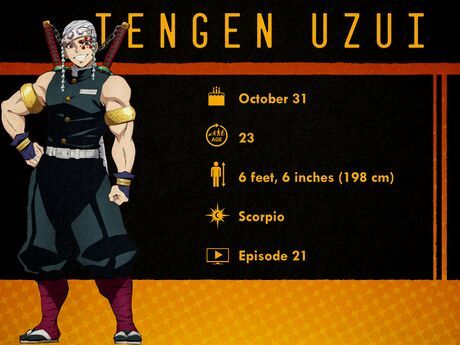 Tengen Uzui - 31 tháng 10Tengen là Sound Hashira của Demon Slayer Corps. Anh có tính cách ồn ào, quyến rũ và đôi khi tự hào về bản thân, với trang phục và phụ kiện sặc sỡ phù hợp với tính cách của mình. Tuy nhiên, sự phô trương của Tengen không làm giảm khả năng chiến đấu của anh, và anh cũng là một Demon Slayer xuất sắc! Sau này, Tengen nghỉ hưu và chuyển sang huấn luyện những học trò mới, nhưng anh vẫn giữ được phong cách kịch tính của mình.
