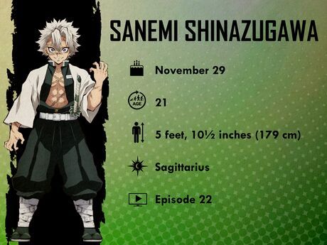 Sanemi Shinazugawa - 29 tháng 11Sanemi là Wind Hashira của Demon Slayer: lạnh lùng, cứng đầu, bướng bỉnh và hoàn toàn bị ám ảnh bởi căm thù đối với quái vật. Sau khi mất hầu hết gia đình, Sanemi thường xuyên đóng kín cảm xúc và xua đuổi bất kỳ ai cố gắng tiếp cận, bao gồm cả người em trai Genya của mình. Anh cũng căm ghét quái vật đến mức tin rằng chúng không thể chung sống hòa bình với con người.