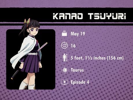 Kanao Tsuyuri - 19 tháng 5Kanao là một Demon Slayer trầm lặng, sống nội tâm và là em gái nuôi của Shinobu Kocho. Những trải nghiệm đau thương trong thời thơ ấu đã dạy Kanao cách bảo vệ bản thân bằng cách đóng chặt cảm xúc; do đó, lúc đầu trong series, Kanao có vẻ như không có cảm xúc và không thể tự đưa ra quyết định. Tuy nhiên, khi series tiến triển, cô trưởng thành và trở thành một nhân vật với cảm xúc rõ rệt hơn.