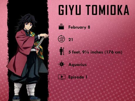 Giyu Tomioka - 8 tháng 2Giyu là một Demon Slayer kỳ cựu và là Water Hashira, cũng là người đầu tiên gặp Tanjiro và Nezuko khi câu chuyện bắt đầu. Anh khá trầm lặng, chỉ nói khi thật sự cần thiết—và mặc dù anh tỏ ra tự tin bên ngoài, Giyu thực ra cảm thấy mình không xứng đáng làm Water Hashira (vì cảm giác tội lỗi về cái chết của người bạn thân Sabito).