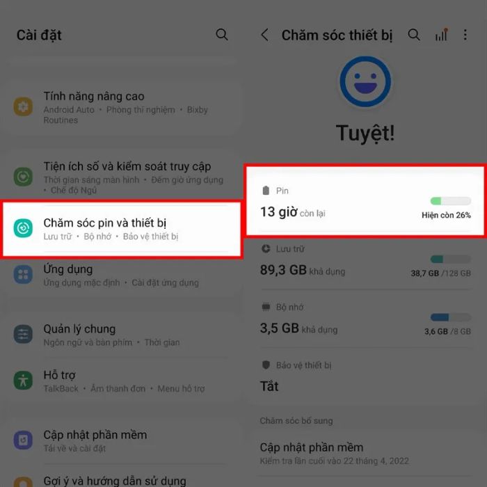 Bước 1: Truy cập ứng dụng Cài đặt trên máy → Đi đến phần Chăm sóc Pin và thiết bị → Sau đó, chọn mục Pin.