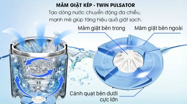 - Công nghệ Mâm giặt kép: Hệ thống hai mâm giặt tạo ra các luồng nước xoáy mạnh mẽ, đa chiều, nâng cao đáng kể hiệu suất làm sạch.
