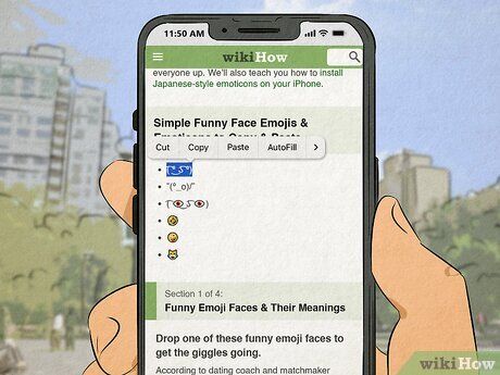 Sao chép và dán biểu tượng cảm xúc trực tiếp từ trình duyệt trên điện thoại của bạn. Nếu bạn thấy một biểu tượng cảm xúc hài hước muốn sao chép và dán, hãy nhấn giữ màn hình cho đến khi biểu tượng cảm xúc bạn muốn sao chép được tô sáng. Nhấn nút sao chép, sau đó di chuyển đến nơi bạn muốn biểu tượng cảm xúc xuất hiện. Nhấn giữ màn hình cho đến khi nút dán xuất hiện, sau đó chọn dán.