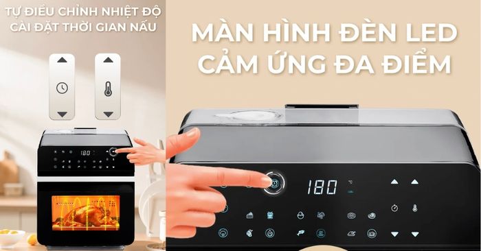 Bạn có thể dễ dàng điều chỉnh nhiệt độ từ 80 đến 200 độ C cho từng món ăn, cùng thời gian nấu từ 0 đến 60 phút. Điều này giúp món ăn được nấu chín đều và đúng độ, không bị cháy hay chưa chín kỹ.