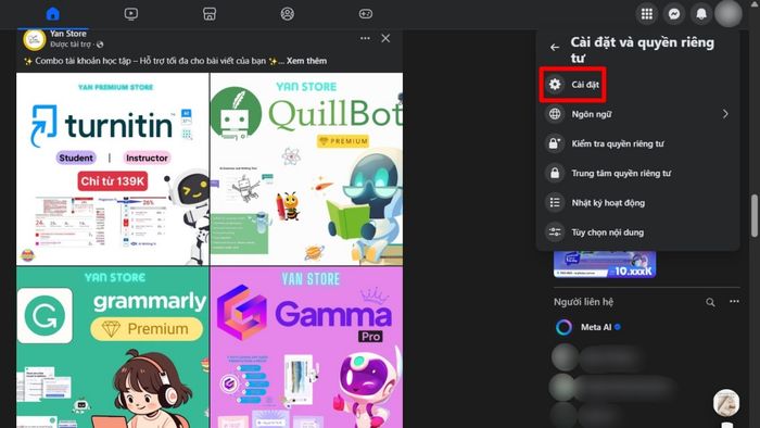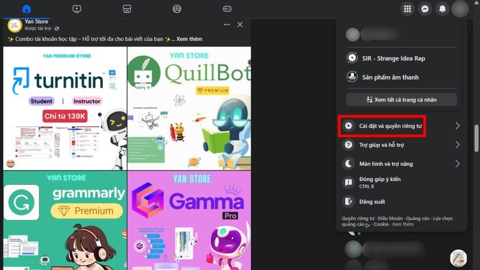 2. Điều hướng đến mục Cài đặt và Quyền riêng tư: Nhấn chọn tiếp vào phần Cài đặt. Giao diện mới sẽ xuất hiện với danh sách các tính năng được hiển thị ở khung bên trái.