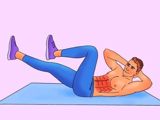 Biến thể gập bụng kết hợp đạp xe không chỉ tác động đến cơ bụng thẳng mà còn giúp săn chắc cơ liên sườn và vùng hông. Bạn thực hiện bằng cách nằm ngửa, hai chân giơ lên tạo góc 45 độ và mô phỏng động tác đạp xe trong khi đồng thời nâng vai lên khỏi mặt sàn. Duy trì bài tập liên tục trong 50 giây, sau đó thư giãn 10 giây trước khi tiếp tục.