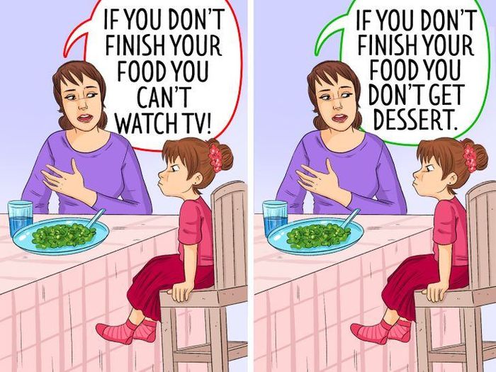 Ví dụ, nếu trẻ không chịu ăn rau, hãy từ chối cho trẻ ăn tráng miệng. Hoặc nếu trẻ không chịu dọn đồ chơi, hãy yêu cầu trẻ không được chơi đồ chơi trong ngày. Tuy nhiên, bố mẹ cần tránh áp dụng những hậu quả không hợp lý, như nếu trẻ không ăn cơm thì không cho phép xem TV hay bắt trẻ dọn nhà, vì điều này có thể khiến trẻ phản kháng mạnh mẽ, thậm chí là bỏ bữa và trở nên bướng bỉnh.