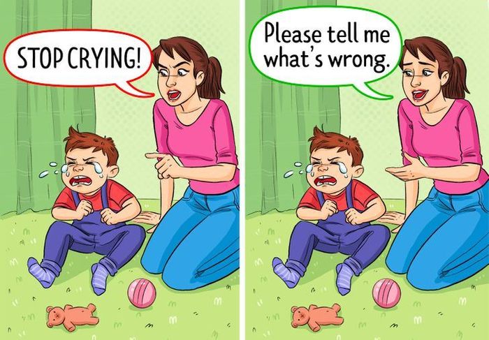 Trẻ em thường bắt chước hành động của cha mẹ, vì vậy chúng ta cần là tấm gương để dạy trẻ cách bình tĩnh. Nếu trẻ khóc và bạn quát mắng, trẻ sẽ coi việc la mắng là điều bình thường và không chú ý đến lời nói của bạn. Đôi khi trẻ có thể còn phản ứng bằng cách phá đồ chơi.