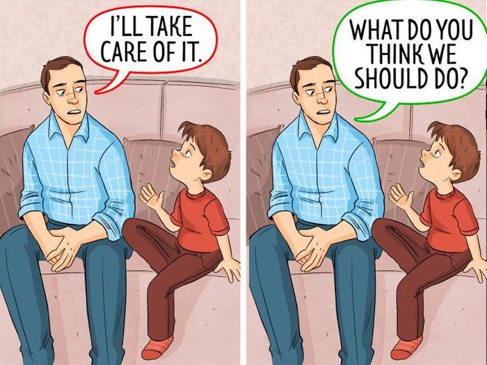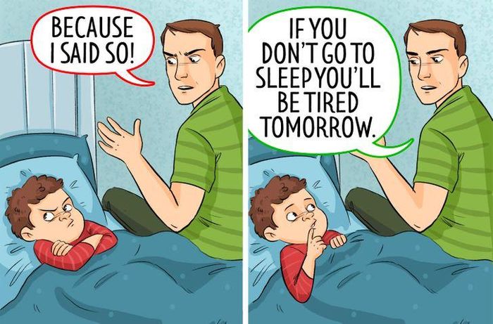 Thay vì chỉ nói "Bố/Mẹ bảo vậy là phải nghe", bạn nên tạo cơ hội để trò chuyện với trẻ, giải thích lý do tại sao trẻ không thể làm điều đó và những gì có thể xảy ra nếu trẻ làm sai. Trẻ nhỏ khó có thể tự nhận thức được hành động của mình có tốt hay không, vì vậy việc cha mẹ giải thích hậu quả của hành động sẽ giúp trẻ nhận thức được điều này. Điều này giúp trẻ học hỏi và tự đưa ra những quyết định đúng đắn cho bản thân sau này, tránh những sai lầm không đáng có.