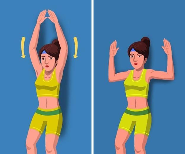 “Trượt tường” là bài tập đơn giản giúp giảm căng cơ ở cổ và vai. Để thực hiện, hãy đứng dựa lưng vào tường, đầu gối hơi cong và giơ hai tay qua đầu. Giữ chặt mu bàn tay, cùi chỏ, vai và cột sống vào tường, sau đó từ từ trượt tay xuống cho đến khi cánh tay nằm thấp hơn vai. Tiếp theo, đưa tay lên và lặp lại động tác 10-12 lần.