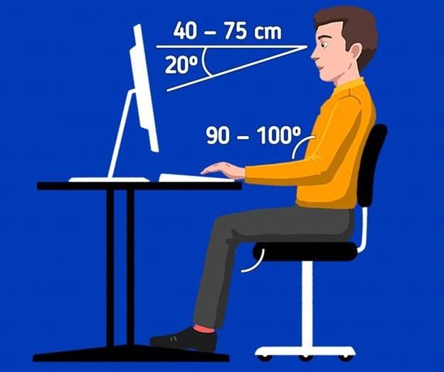 Khuỷu tay và đầu gối của bạn nên tạo thành một góc 90°, trong khi hông có thể hơi vượt qua góc vuông một chút để tạo sự thoải mái cho lưng khi ngả ra phía sau. Hãy điều chỉnh màn hình máy tính sao cho nó ngang tầm mắt để tránh căng thẳng cho cổ và mắt. Bàn phím cũng cần được đặt cách mép bàn khoảng 10-15 cm để bàn tay và cổ tay có thể nghỉ ngơi dễ dàng.