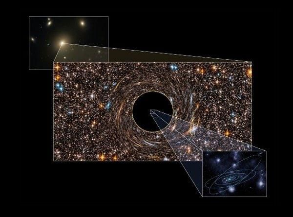 lỗ đen siêu lớn ở trung tâm, với khối lượng lên tới hàng triệu đến hàng tỷ lần khối lượng Mặt trời. Vào năm 2011, các nhà khoa học phát hiện ra hai trong số những lỗ đen lớn nhất ở hai thiên hà gần chúng ta. Một trong số đó là thiên hà NGC 3842 – thiên hà sáng nhất trong cụm Leo, cách chúng ta khoảng 320 triệu năm ánh sáng, với hố đen trung tâm có khối lượng lên đến 9,7 tỷ lần khối lượng Mặt trời.