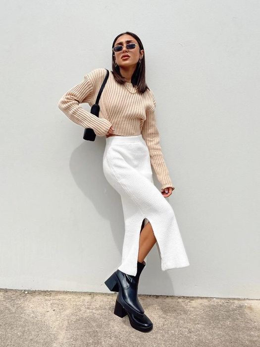 Váy xẻ tà là kiểu váy cực kỳ được ưa chuộng trong thời gian gần đây. Với thiết kế xẻ tà ở mặt trước hoặc mặt sau, váy giúp bạn khoe được đôi chân dài miên man một cách quyến rũ. Kết hợp với áo sweater, bạn sẽ có một set đồ vừa ấm áp lại vừa cực kỳ thời trang và nữ tính. Bạn có thể lựa chọn các kiểu váy xẻ phù hợp như váy xẻ chiết eo hoặc váy xẻ dáng vuông. Nếu muốn tạo thêm điểm nhấn cá tính và năng động, đừng quên phối cùng các phụ kiện như boots thấp, túi xách hay trang sức nhé.