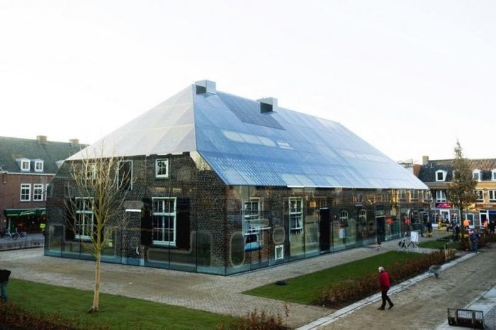 Nằm giữa khuôn viên với nhiều di tích cổ kính, văn phòng Glass Farm không làm xáo trộn vẻ đẹp nguyên sơ của không gian xung quanh. Thay vào đó, công trình này mang đến những trải nghiệm thú vị và đầy bất ngờ. Toàn bộ ngôi nhà được bao phủ bởi lớp kính trong suốt, bên trong là những bức tường lát gạch màu nâu sẫm. Các kỹ sư Hà Lan đã thiết kế công trình này theo phong cách của một nông trại cổ, nhưng vẫn giữ được nét cổ kính của thị trấn, tạo nên một sự hòa quyện độc đáo giữa cũ và mới. Mặc dù được bao phủ bởi kính, nhưng văn phòng Glass Farm vẫn mang lại một cảm giác tươi mới cho du khách.