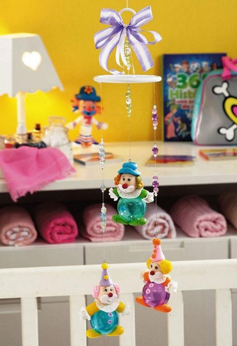 - Bước 11: Tạo thêm hai chú hề nữa và kết nối chúng với hạt cườm, dây ruy băng để tạo thành chuông gió.