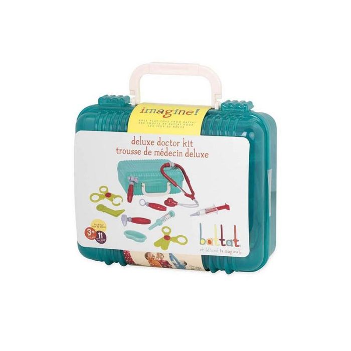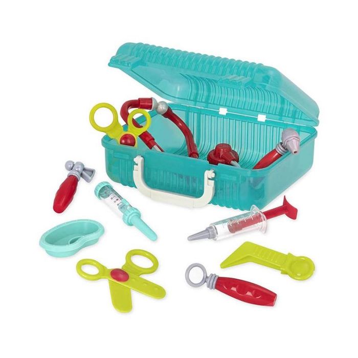 Với hơn 114 năm kinh nghiệm, các sản phẩm của Battat luôn mang tính giáo dục cao và được sản xuất theo tiêu chuẩn an toàn nghiêm ngặt. Bộ đồ chơi bác sĩ bao gồm 11 dụng cụ như kéo, kẹp, nhíp, gương, vồ, ống nghe, nhiệt kế, ống tiêm, khay và máy đo tai, tất cả đều được đựng trong một hộp xinh xắn. Được làm từ nhựa cao cấp, bộ đồ chơi này đảm bảo an toàn cho bé. Đồng thời, nó cũng giúp bé học hỏi và làm quen với nghề bác sĩ, phát triển kỹ năng giao tiếp.