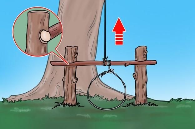 Giữ một nhánh cây ngang bằng cách tạo các rãnh ở hai đầu cọc cắm xuống đất và sử dụng dây để cố định phần thân cây phía trên. Sau đó, buộc một thòng lọng vào nhánh cây ngang bằng cách sử dụng nút thắt dây cung như trong hình để tạo ra bẫy thú. Bẫy này rất hiệu quả đối với các loài động vật nhỏ như thỏ và cáo.