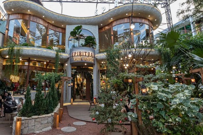 Spiritual Coffee Roaster là một trong những quán cà phê nổi bật tại Sài Gòn với không gian rộng rãi, tinh tế và chăm chút kỹ lưỡng từng chi tiết nhỏ. Quán nằm trên mặt tiền Trường Chinh, dễ tìm và gây ấn tượng mạnh ngay từ cái nhìn đầu tiên nhờ thiết kế mở, kết hợp với các mảng xanh tươi và ánh sáng tự nhiên từ giếng trời. Với hai tầng, khu ngoài trời có sân vườn xanh mát và ánh đèn ấm áp vào buổi tối, mang đến không khí lãng mạn, như một góc Noel giữa lòng thành phố. Không gian trong quán yên tĩnh, decor sang trọng, với cả phòng họp phục vụ cho nhóm làm việc hoặc học bài.