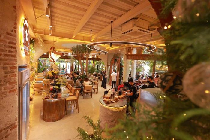 Không gian rộng rãi, nhiều cây xanh tự nhiên được bố trí hợp lý, mang đến cảm giác thư thái ngay khi bước vào. Buổi sáng, khi quán vừa mở cửa lúc 7h30, là thời điểm lý tưởng để chụp ảnh vì ánh sáng tự nhiên đẹp và quán chưa đông khách.