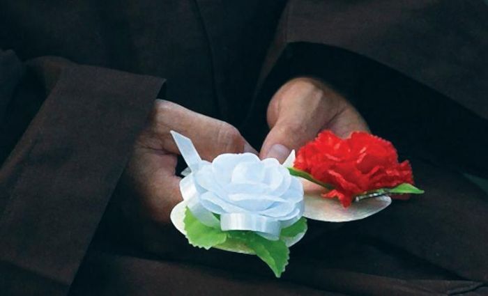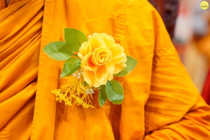 Bên cạnh hai màu hoa hồng đỏ và trắng quen thuộc, bông hồng vàng cũng xuất hiện và được cài lên ngực áo của các vị tu sĩ. Những người đã chọn đời sống xuất gia, rũ bỏ trần tục để theo con đường giải thoát. Họ mượn thân thể do cha mẹ ban cho để cầu đạo, cứu độ chúng sinh. Giác ngộ chính là cách báo hiếu trọn vẹn cho cha mẹ hiện đời và nhiều đời kiếp trước.