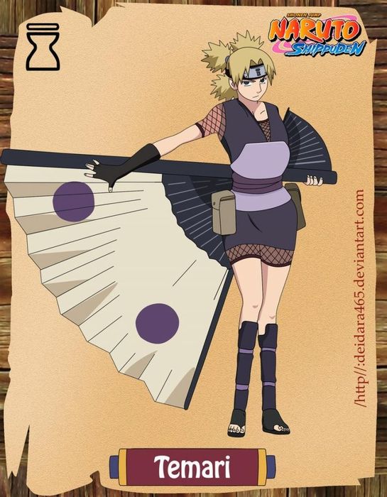Temari là con cả của Kazekage Đệ Tứ, đồng thời là chị của Gaara và Kankurou. Vũ khí đặc trưng của Temari là một chiếc quạt khổng lồ, dùng để tạo ra những cơn lốc và gió mạnh, thổi bay đối thủ. Cô cũng có thể tạo ra lốc xoáy và bão để tấn công kẻ địch.