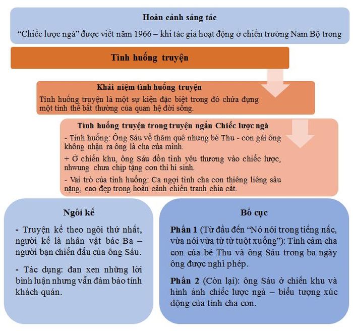 Truyện ngắn "Chiếc lược ngà" được viết năm 1966, trong bối cảnh chiến tranh chống Mỹ đang diễn ra ác liệt. Tác phẩm được kể qua lời của bác Ba, người bạn chiến đấu thân thiết của ông Sáu. Cách kể chuyện này không chỉ mang tính khách quan mà còn giúp người đọc cảm nhận được sự chân thực và xúc động trong từng chi tiết. Câu chuyện xoay quanh tình cha con giữa ông Sáu và bé Thu, một tình cảm thiêng liêng nhưng lại chịu nhiều éo le do hoàn cảnh chiến tranh.