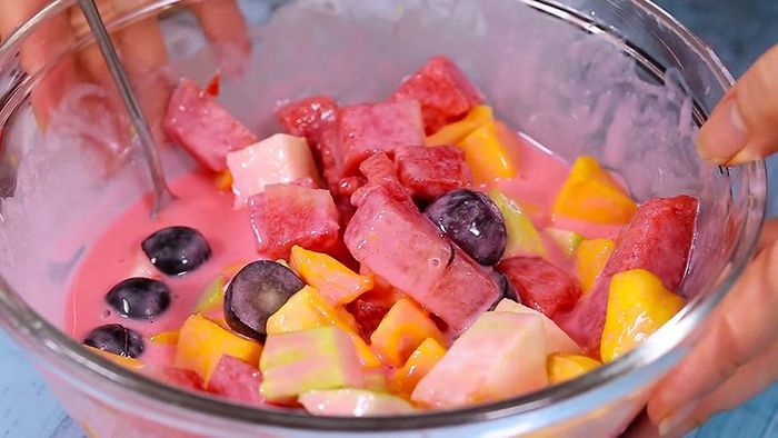 - Bước 2: Múc trái cây trộn ướt ra cốc, rót theo cả nước trộn. Bạn có thể bày thêm kem phía trên cùng của cốc.
