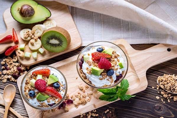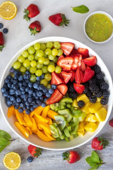 - Trái cây: các loại trái cây mà bạn yêu thích, nên chọn những loại có nhiều màu sắc đa dạng và hương vị khác nhau như kiwi, dâu tây, lê, dưa, nho, dứa,…
