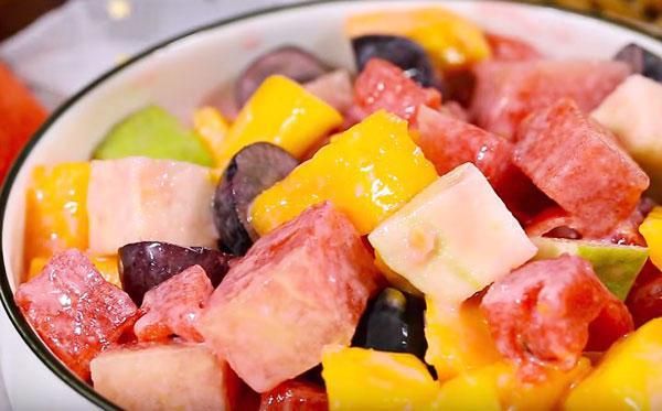 - Bước 1: Rửa sạch trái cây và gọt vỏ cho những loại cần bỏ vỏ, thái lát và xắt nhỏ cỡ quân cờ. Đổ chung trái cây vào một tô lớn, rưới mật ong hoặc nước đường đun sánh đều khắp. Trộn nhẹ tay và để khoảng 2 tiếng trong ngăn mát tủ lạnh.