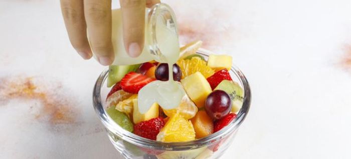 - Hoa quả tươi rửa sạch, gọt vỏ, cắt hạt lựu hoặc miếng vừa ăn.
