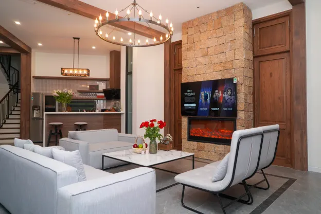 Biệt thự có 3 phòng ngủ, bếp với tủ lạnh và minibar, TV màn hình phẳng, khu vực ghế ngồi, 3 phòng tắm được trang bị vòi sen.