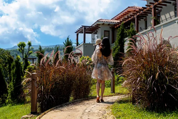 - Sân vườn rộng lớn với hoa hồng rực rỡ và sân cỏ cho hoạt động team building.